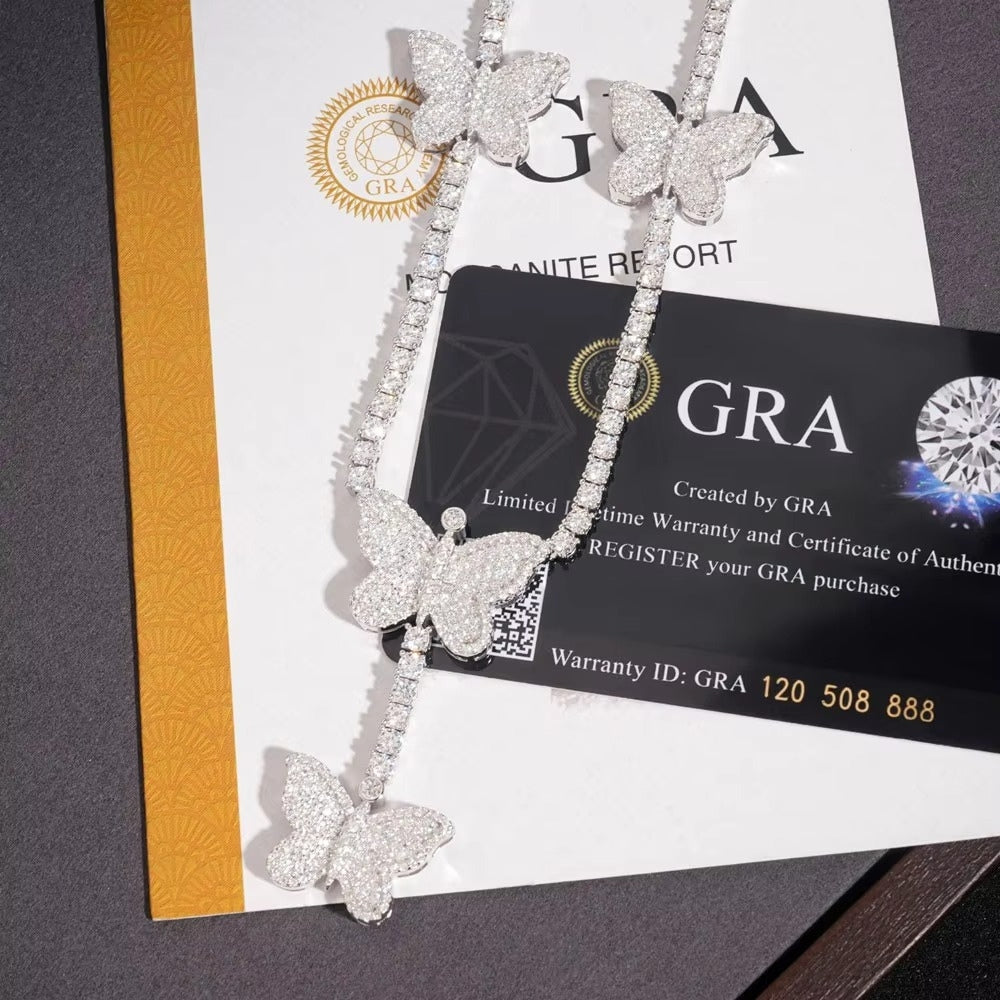 This Butterfly Lab Stone Tennis Chain is crafted in premium .925 sterling silver and set with brilliant moissanite lab stones for exceptional sparkle. Delicate butterfly accents add a touch of elegance and charm, making this piece perfect for both everyday wear and special occasions. Designed to shine beautifully from every angle, it delivers timeless style with modern luxury.